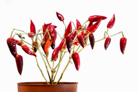 Dry red pepper plant with no leaves in a pot isolated on white.