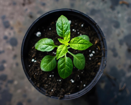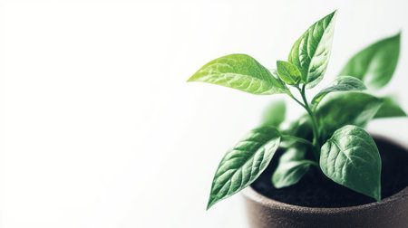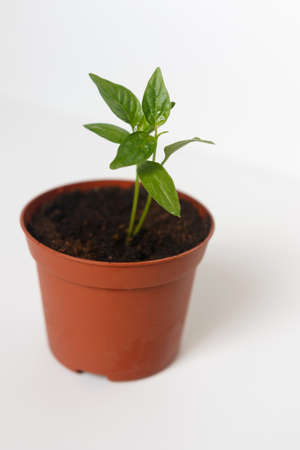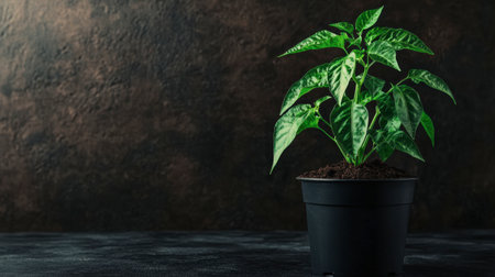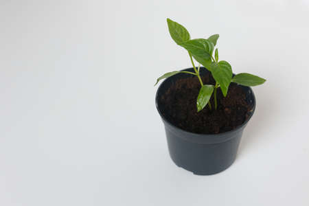 One green bell pepper plant in a black ceramic pot with soil, perfect for sustainable food visuals.