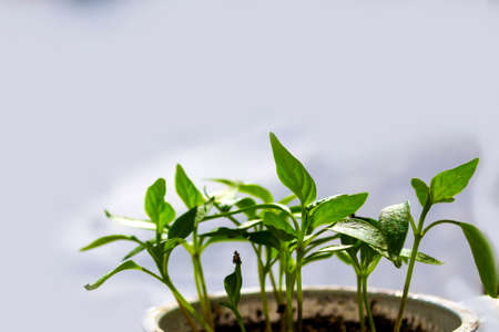 Early seedling , grown from seeds in boxes at home on the windowsill. seedlings in peat pots.Baby plants seeding, black hole trays for agricultural seedlings.The spring planting.