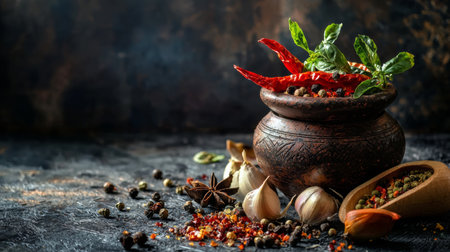 A rustic clay pot filled with dried red chilies, garlic cloves, and assorted spices on a textured dark surface. The earthy tones and natural ingredients evoke themes of traditional cooking, organic food, and culinary spices.