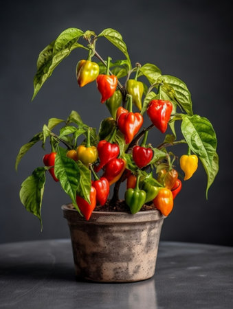 a close-up of ripe chili peppers hanging from a plant on a marble countertop, created with generative ai