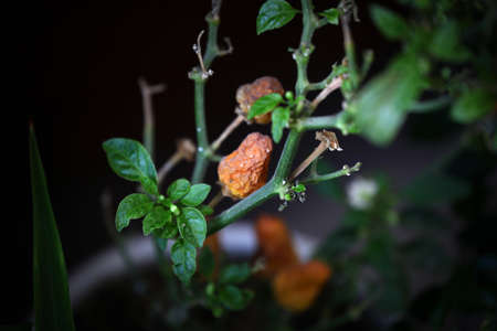 Bhut Jolokia chili pepper, one of the hottest pepper in the world. Home made gardening, organic food, selective focus.