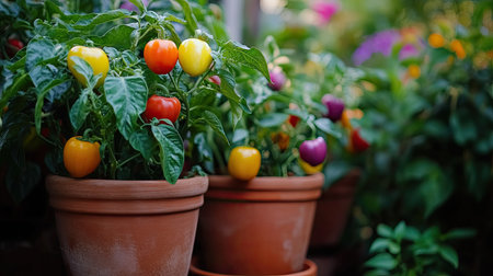 A close-up of colorful paprika fruits growing in clay pots, with nightshade plants adding depth to the scene.