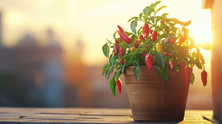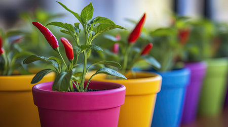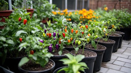 A vibrant home gardening scene featuring multiple clay pots with chili pepper plants in bright colors.