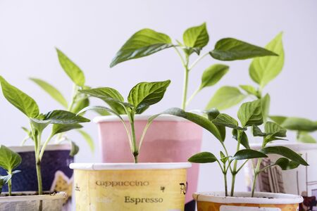 Small chili plants inside a biodegradable bag. Growing paprika plants. Top view of chili pepper plants still without fruit. Farming. Plantation. Leaves. Outdoor. Spicy. Organic. Food. Natural.