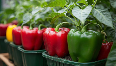 Colorful bell peppers ripening inside a greenhouse during the growing season