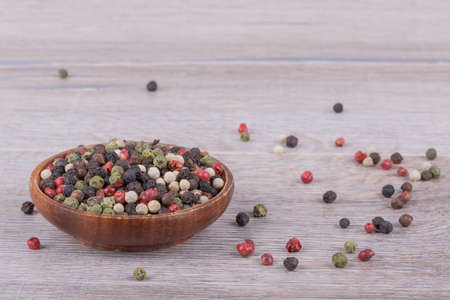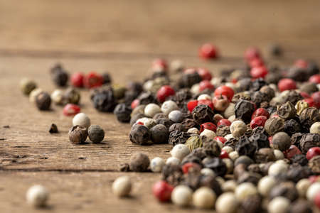 Heap of Dry Multicolored Peppercorns on Wooden Background. Dry Peper Mix Top View