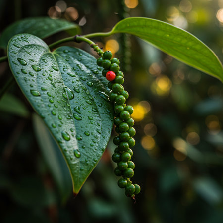 Close-up of fresh black pepper plant growing at farm. Selective focus.