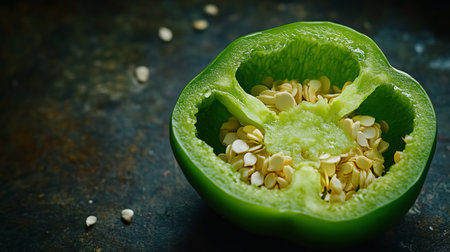 A close-up view of a halved green pepper showcasing its seeds and vibrant texture. Perfect for food photography, cooking blogs, or fresh ingredient showcases.