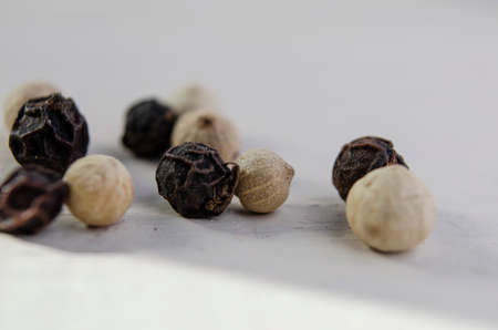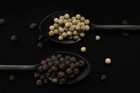 Black peppercorns in black metallic spoon, white peppercorns in black metallic spoon close-up