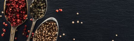 peppercorns red.Close up of Rainbow colourful peppercorns on a black slate background