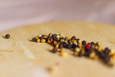 Grains of mixed pepper spilled on a marble kitchen counter. Organic spices. Peppercorns.