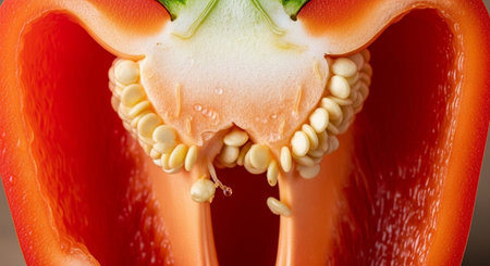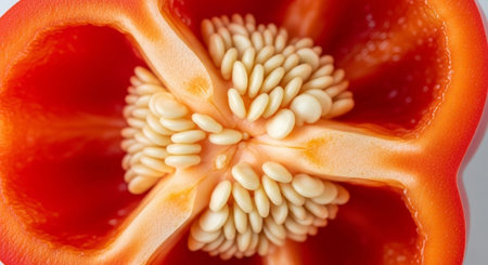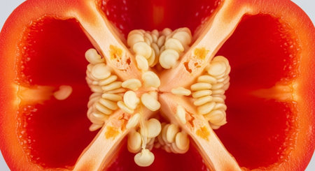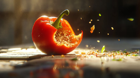 A beautifully shot fresh red pepper revealing its seeds, scattered spices, and vibrant colors. Perfect for culinary projects or healthy eating themes.