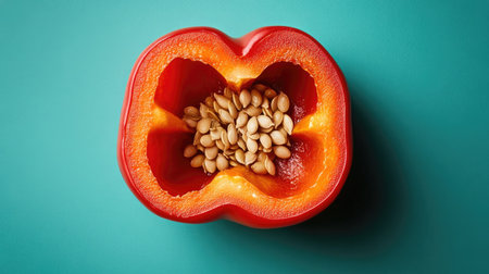 A halved bright red bell pepper reveals seeds, set against a turquoise background. Perfect for healthy eating, cooking, and food photography projects.