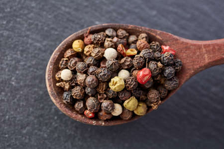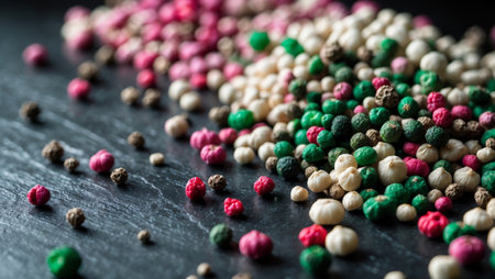 AI Generated. Close up view of peppercorns with different colors arranged on a dark slate surface