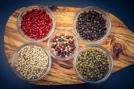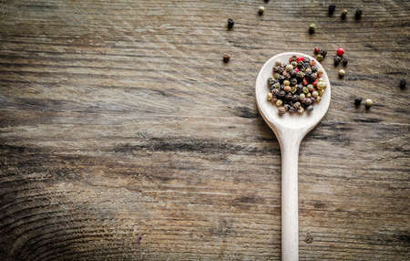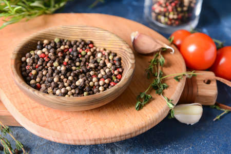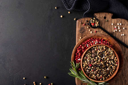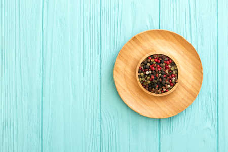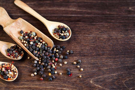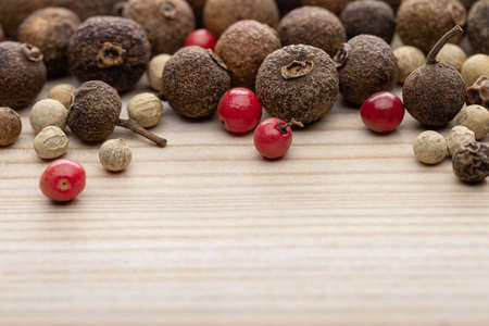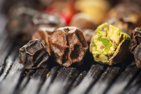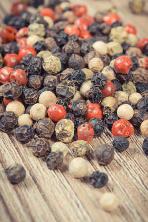 Colored pepper on wooden board. Spice using for cooking. Fragrant seasoning