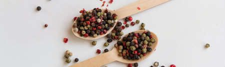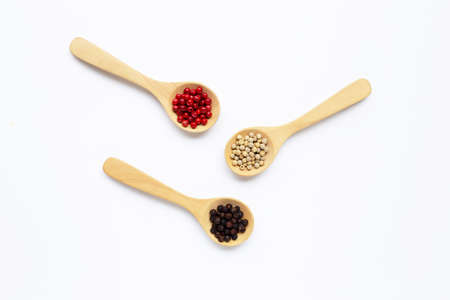 Red, white and black peppercorns with wooden spoon on white background.