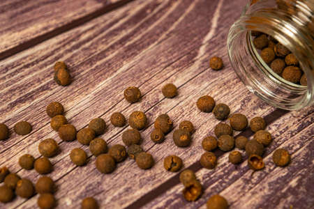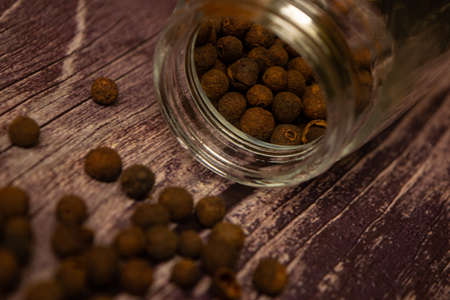Black allspice scattered on a wooden background and a glass spice jar with black pepper lying on its side. Close up