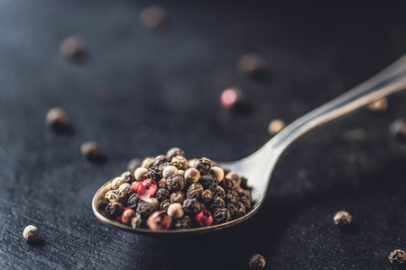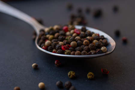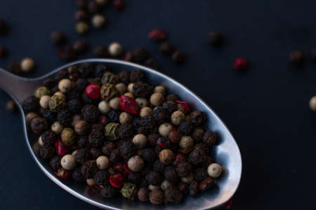 Various colored pepercorns on a dark background
