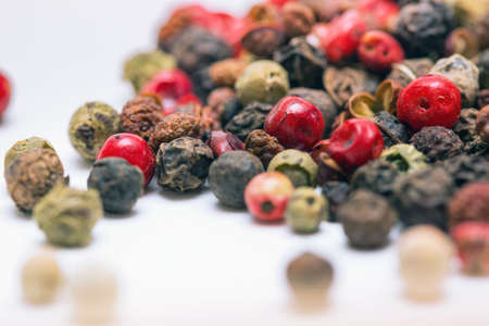 Red, green, white and black peppercorns on a white background, copy space for text.