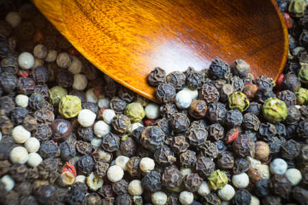 pepper in wooden spoon/ mixture of red pepper, black pepper, white pepper, green pepper