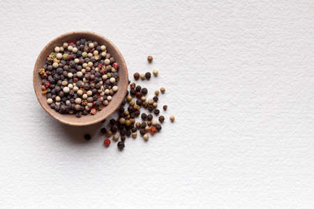 Mix of peppers; red pepper, black pepper, white pepper and green pepper in a bowl