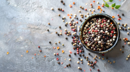 A ceramic bowl filled with colorful peppercorns sits on a gray surface. The bowl is overflowing with black, white, and red peppercorns. Some peppercorns have fallen out of the bowl and are scattered around it.