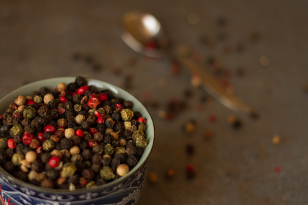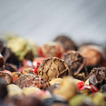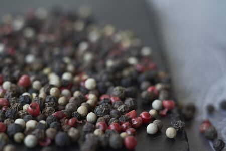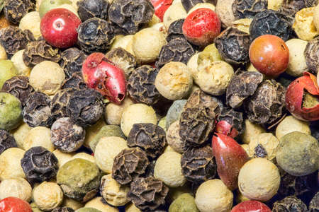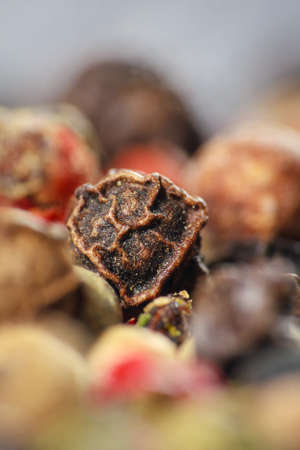Pepper spice texture. Multicolored pepper corns, colorful mix grains. Selective focus.
