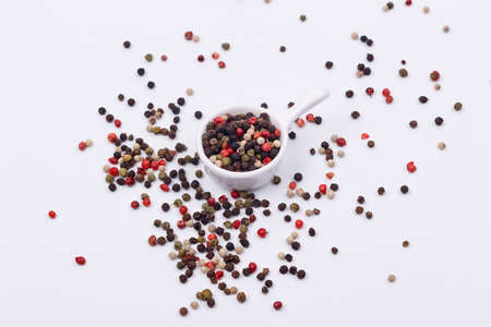 A mixture of multi-colored pepper in a small saucer on a white background. Isolate