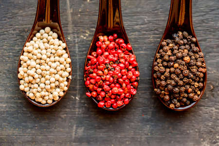 Black, pink and white peppercorn over wooden background