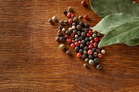 Bay leaves with black pepper and spice corn in wooden background