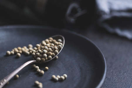Whole pepper spice. White peppercorn grain in spoon on plate.