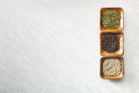Three different types of pepper spice. Green, white and black peppercorn in the bowls. Top view.