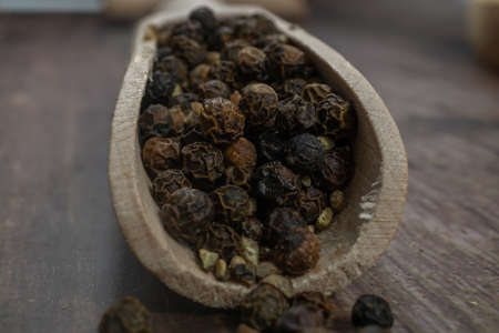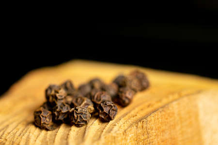 black pepper grains on wooden background close-up