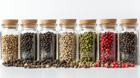 A vibrant assortment of spices displayed in glass jars with cork lids, showcasing various types of pepper to enhance culinary creations and flavors.