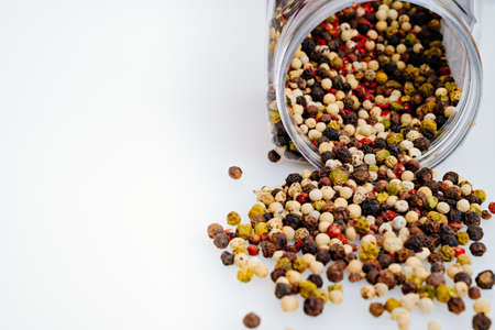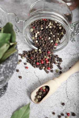 Seasoning for food, spices, flavor additive. Peppercorns black white red scattered in a glass jar.