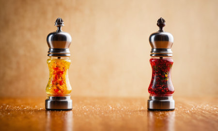 An action-packed image showcasing levitating salt and pepper shakers alongside spice mills filled with colorful peppercorns