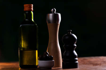 Pepper shaker with papper corn on wooden background. Dark effect style pictures