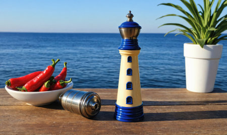 A lighthouse-shaped salt and pepper shaker sits on a wooden table overlooking the ocean