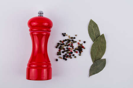 Metal pepper mill in eastern style lying in a wooden box filled with sweet-scented pepper