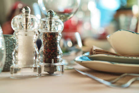 Close up of wooden salt and pepper shakers, cafe interior, blurred background, copy space