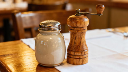 View of a restaurant table setting showing a tall, grainy wooden pepper mill and a round stoneware salt shaker on a white cloth and varnished wood surface.