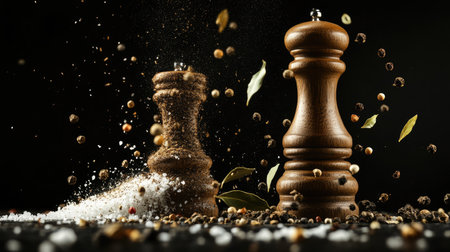 An artistic representation of levitating salt and pepper shakers with spice mills, filled with peppercorns and bay leaves, against a black background