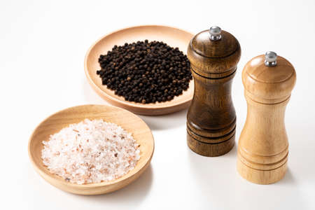 Salt or pepper wooden mill filled with peppercorns on yellow background.