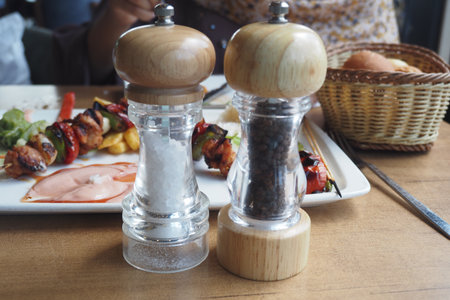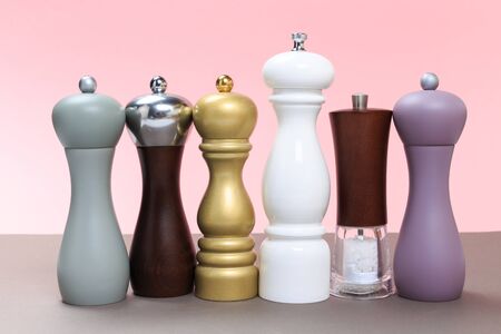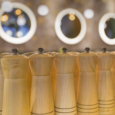 Number of wooden mills with salt and pepper in a restaurant. Shot with a small GRIP