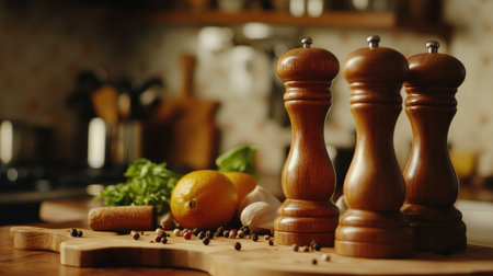 A rustic kitchen scene featuring wooden spice mills and fresh ingredients like lemon, garlic, and herbs, perfect for culinary storytelling and cooking inspiration.