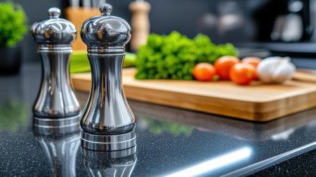 A salt and pepper shakers sitting on a counter with vegetables, AI