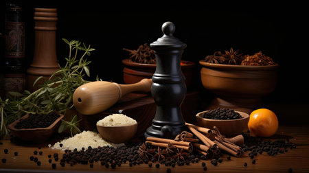 A mesmerizing shot of spice grinders in motion, with colorful peppercorns and fragrant bay leaves suspended in air,
