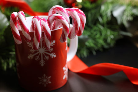 Merry Christmas and Happy New Year greeting card. Two candy canes on black background with copy space for your text.