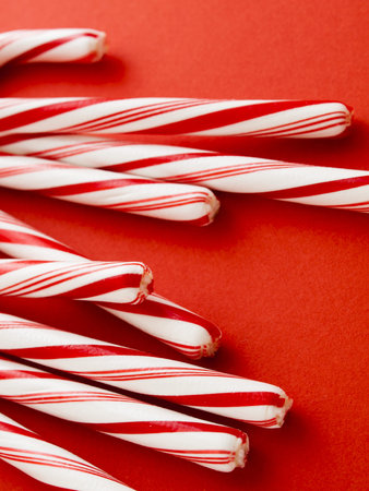 Christmas candy canes on red background. Minimal composition with red and white striped peppermint candies. Top view